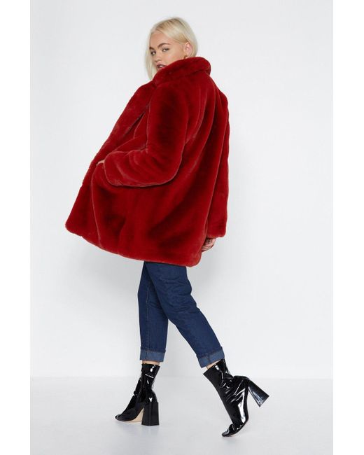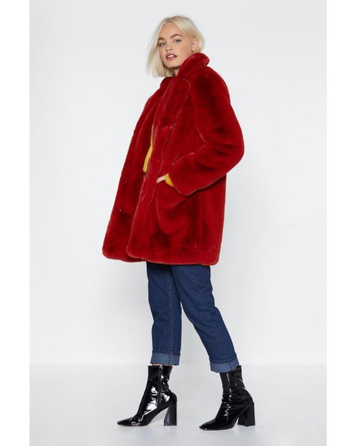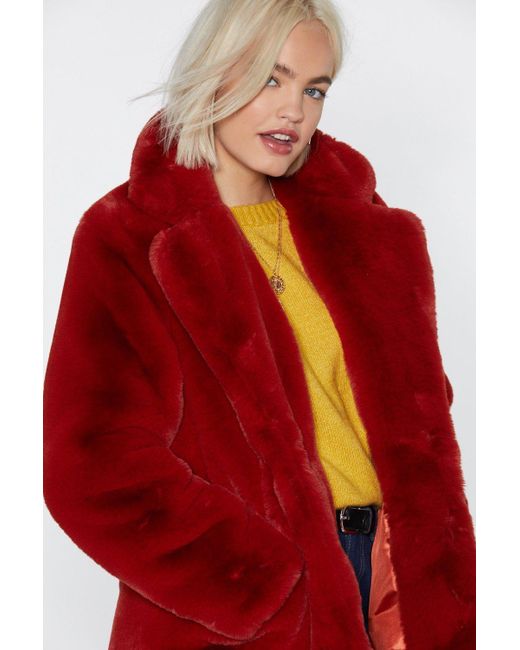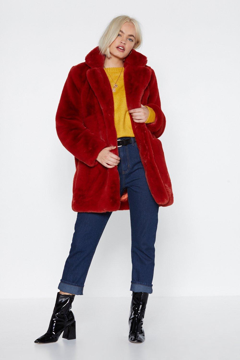 Bird is the word, babe. The surfin' bird coat comes in faux fur and features a longline, oversized silhouette, snap closures at front, and two pockets at sides. Lined.. Colour: red