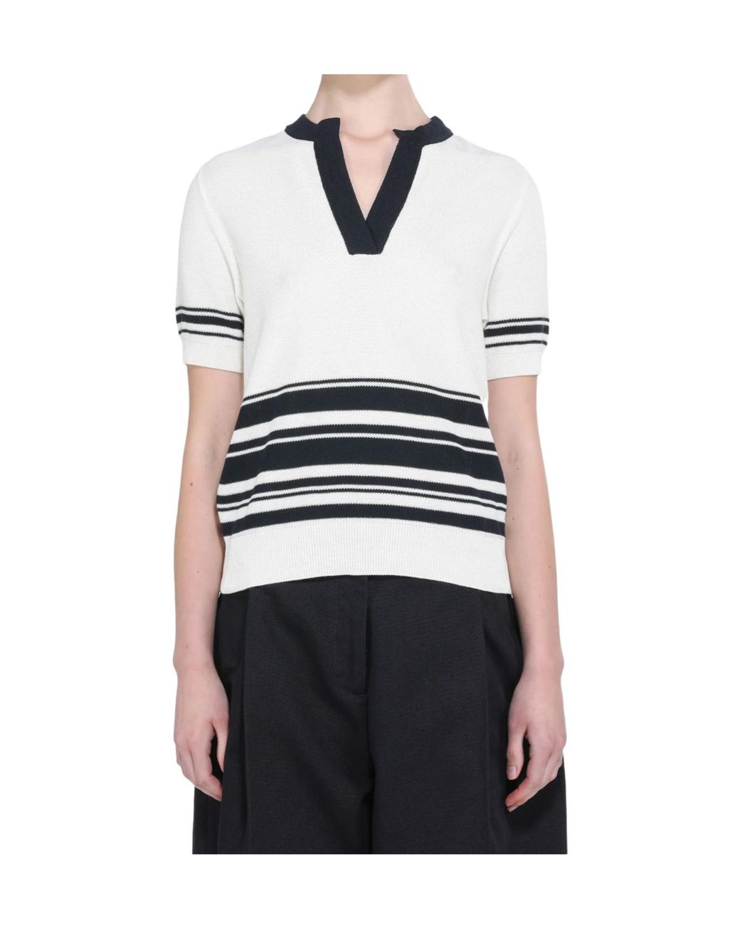 V-neck, short-sleeved, striped knit jumper. Colour: white
