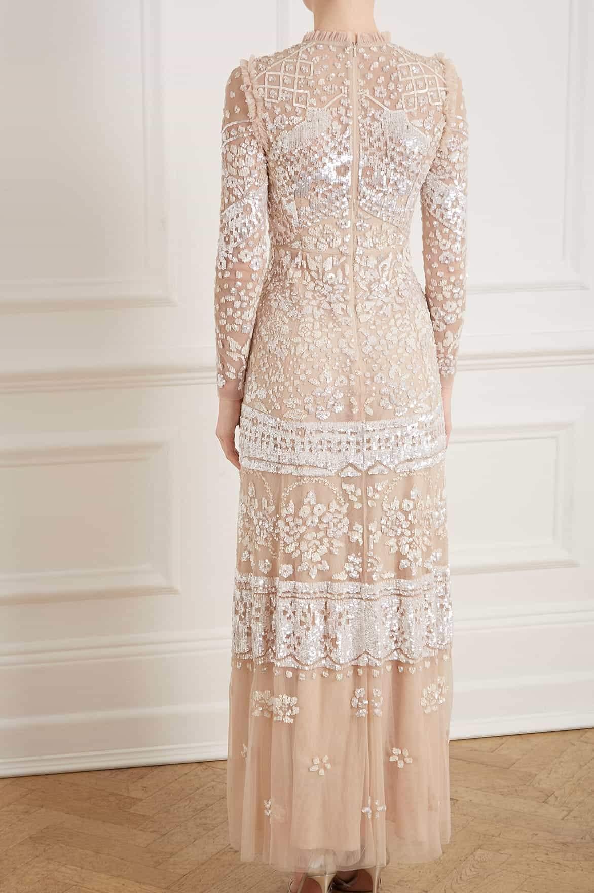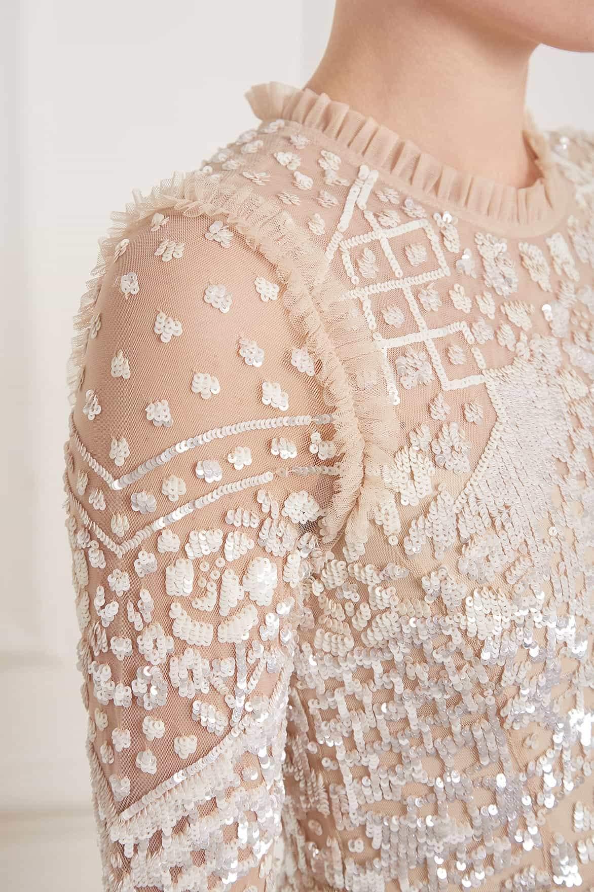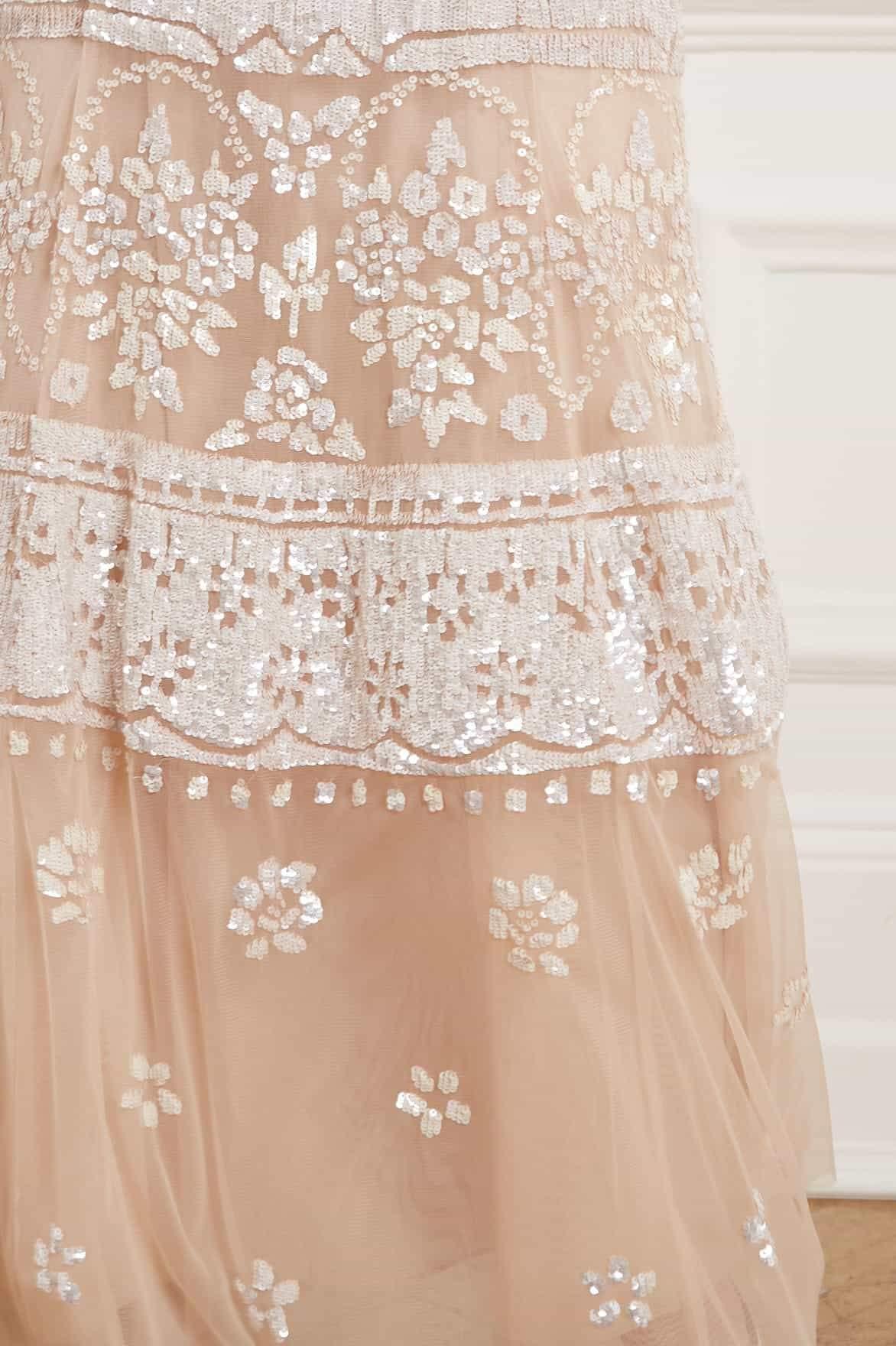 The Aurora Gown in Vintage Blossom. This light catching floor-length dress is decorated with silver shimmering sequins inspired by vintage lace tablecloth. The Aurora is a long sleeve dress with pretty floral elements, engineered to flatter the A-line silhouette. There is delicate frill lace detailing around the neck and arm for further intrigue. Style yours with an on-trend hair ribbon for the perfect look. Tulle adorned with tonal sequins. 100% Polyester shell and lining. Bodice partially lined. Skirt fully lined. Concealed zip at centre back. Delicate dry clean only. Do not wash. Do not bleach. Do not tumble dry. Cool iron on reverse. Due to the delicate nature of the embellishment on this garment please handle with care. Form fitted bodice, fitted sleeve with a multi-layered full skirt. Floor length. Model is 175cm / 5ft 9in and is a UK size 8. Colour: pink