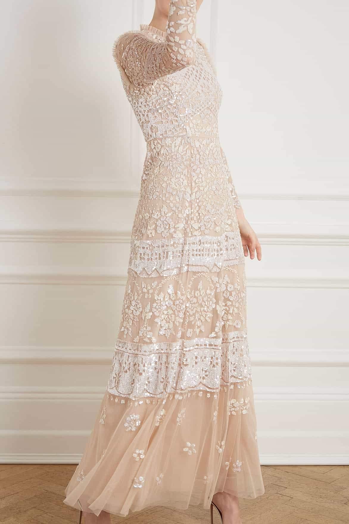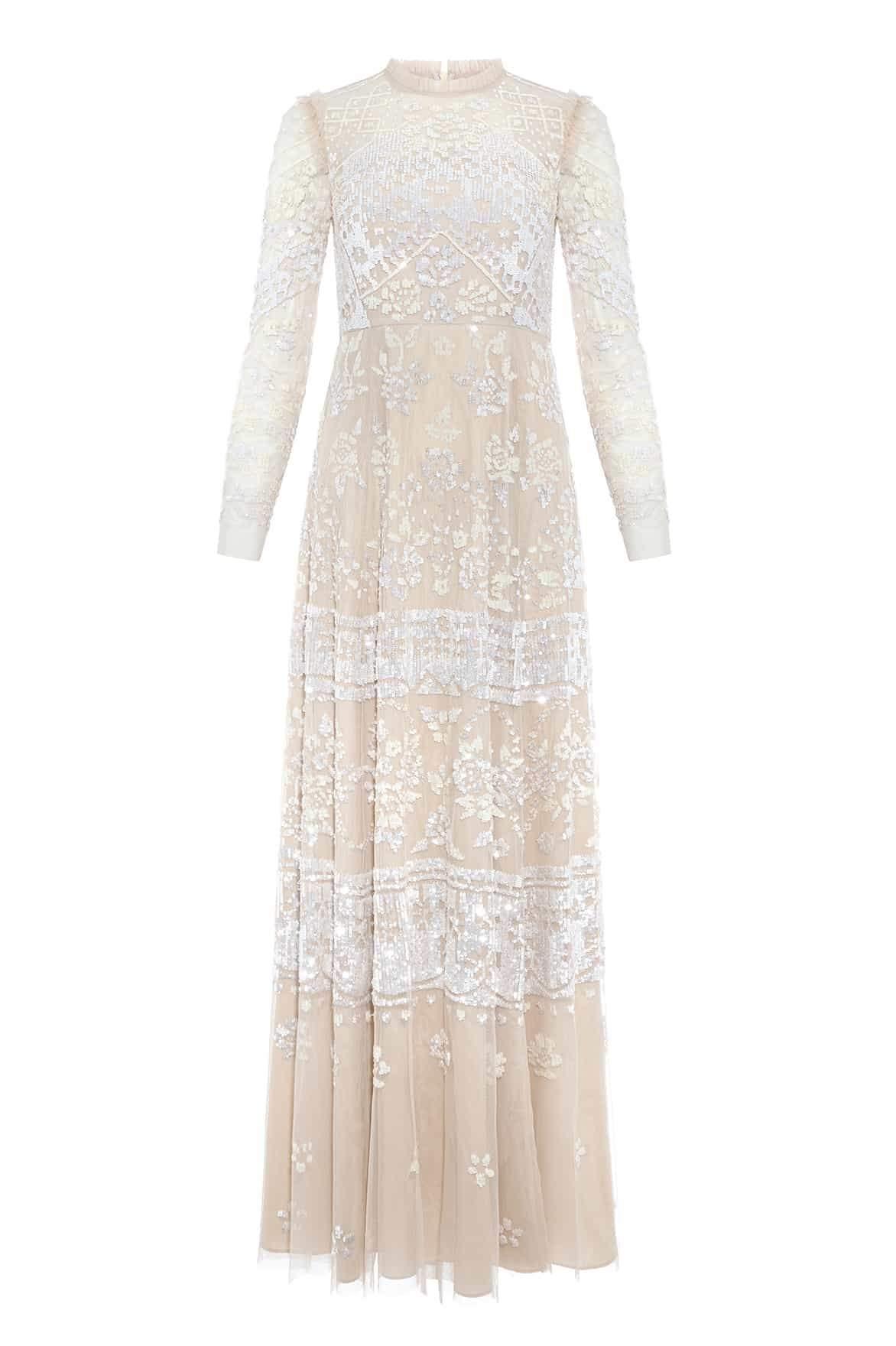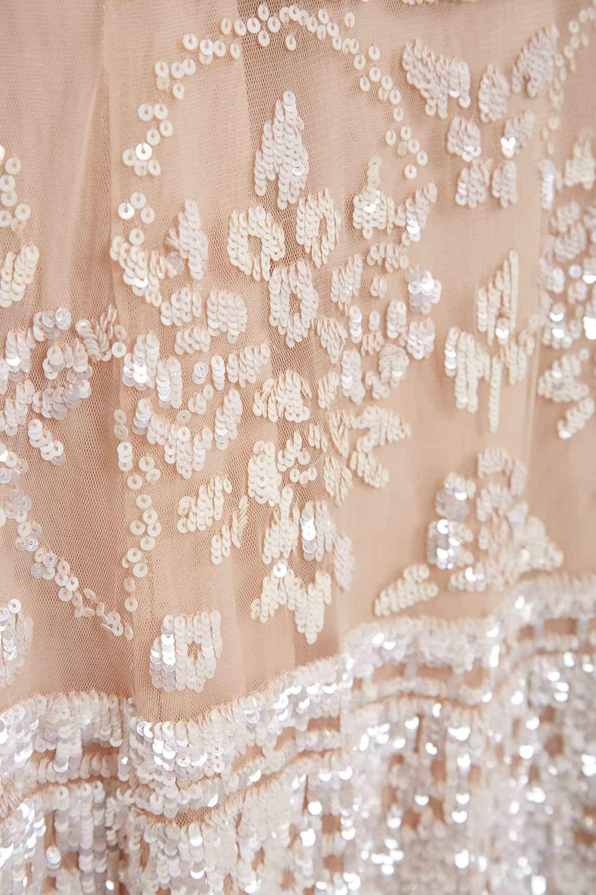 The Aurora Gown in Vintage Blossom. This light catching floor-length dress is decorated with silver shimmering sequins inspired by vintage lace tablecloth. The Aurora is a long sleeve dress with pretty floral elements, engineered to flatter the A-line silhouette. There is delicate frill lace detailing around the neck and arm for further intrigue. Style yours with an on-trend hair ribbon for the perfect look. Tulle adorned with tonal sequins. 100% Polyester shell and lining. Bodice partially lined. Skirt fully lined. Concealed zip at centre back. Delicate dry clean only. Do not wash. Do not bleach. Do not tumble dry. Cool iron on reverse. Due to the delicate nature of the embellishment on this garment please handle with care. Form fitted bodice, fitted sleeve with a multi-layered full skirt. Floor length. Model is 175cm / 5ft 9in and is a UK size 8. Colour: pink