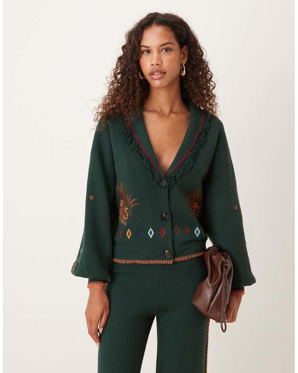 Women's Green Safari Embroidered Knitted Cardigan