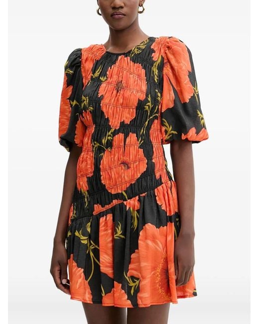 Women's Orange Shirred Floral Midi Dress
