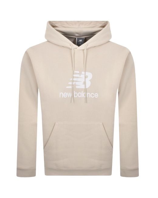 New Balance Sport Essentials Logo Hoodie in Timberwolf Beige. Relaxed Fit. A large hood featuring beige drawstrings and ribbed cuffs on the long sleeves. A stretch ribbed waistband with a kangaroo style pocket at the waist. The signature New Balance logo is printed on the chest in white. 60% Cotton And 40% Polyester. Colour: natural