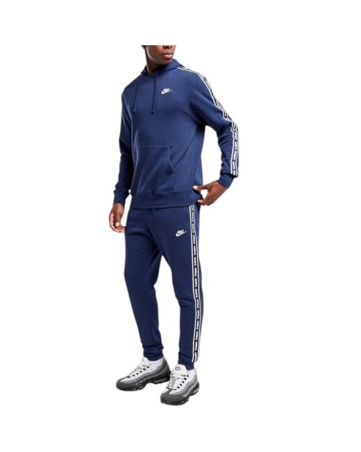 Nike Club Tape GX Suit in Midnight Navy Plush 2-piece suit crafted from high-quality, sustainable and breathable materials. Great for training and active leisure. The top half is an overhead hoodie complete with adjustable drawstring hood, rib cuffs and hem, contrast sleeve branding tape, front kangaroo pouch pocket and Nike logo to left chest. The matching bottoms boast an elasticated adjustable drawstring waistband, rib cuffs, open hand pockets and the same matching contrast side tape Colour: blue