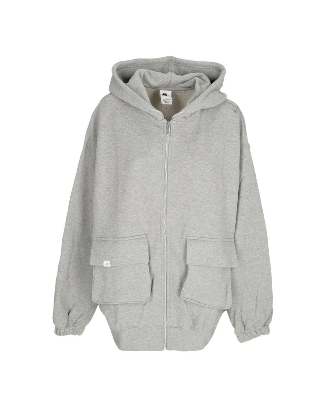 Stay cosy and stylish in this Nike zip-through sweatshirt for women. Featuring an adjustable hood with drawstring, zip closure, front pockets, and an oversized fit. The Nike logo is inverted on the back, with the Swoosh logo embroidered on the shoulder. Made of 100% cotton. Hand wash or machine wash according to the label instructions. Colour: grey