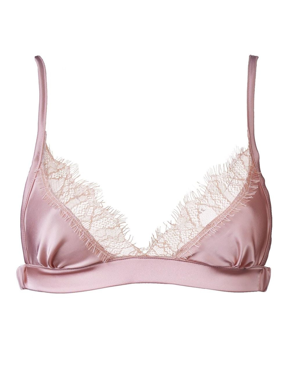 A delicate and soft triangle bralette trimmed in recycled eyelash lace. The bra has modest coverage and is quite sexy, yet it holds the décolletage in. The bra is fastened with a hook&eye fastening. After XL high guage components and wider elastics/straps are used to created increased support. Mix and match this bra with any of the Luna satin program consisting of an unpadded underwired bra, string, brief, cami, shorts and robe for a high end, glamourous co-ordinated look. Cold handwash only 30% Silk 30% Viscose 35% Recycled polyester 5% Polyamide This is excluding trim. The eyelash lace is 100% recycled polyamide with mechanical stretch. Colour: pink