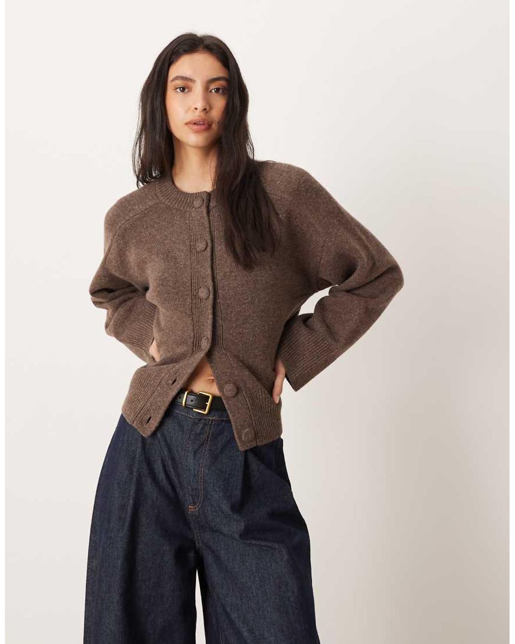Wool Blend Crochet Trim V Neck Cardigan - Brown
