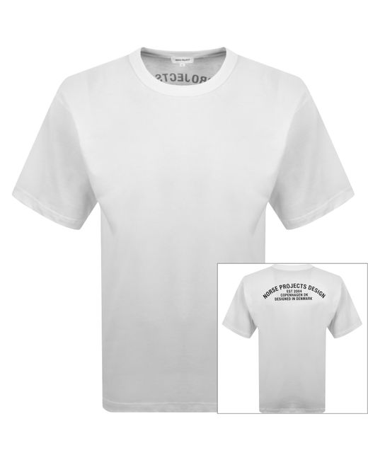 Norse Projects Simon Arch Print T Shirt In White Loose Fit. An organic heavyweight t shirt with a ribbed crew neck and short sleeves. An arched Norse Projects logo is printed on the reverse. 100% Organic Cotton. Colour: white