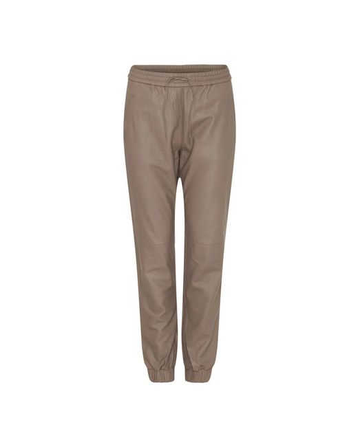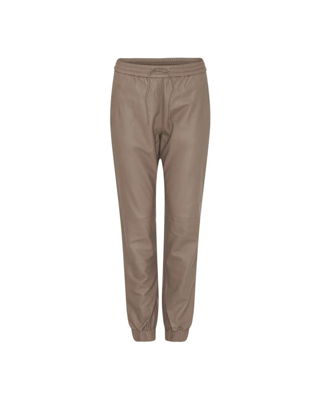 Notyz Leather Jogger Trousers Skind 11153 combine soft lambskin with a relaxed jogger silhouette, featuring an elasticated waistband and adjustable drawcords for everyday comfort. Key attributes: Beige | Latte | Lambskin | Elastic waistband | Drawstring at waist and ankles | Classic pockets | Jogger silhouette | Wide elastic waistband | Ankle drawcord | Classic side pockets | Soft lambskin surface | Dimensions & fit: Size 34: Waist: 35 x 2 cm | Size 34: Hip: 44 x 2 cm | Size 34: Inseam: 70 cm | Size 34: Leg opening: 12 x 2 cm | Slightly relaxed fit | Composition & care: 100% lambskin | Dry clean by leather specialist. Colour: brown