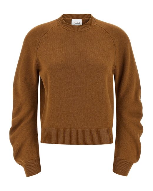 Virgin wool crewneck jumper with long cuffed sleeves and a curved silhouette. NUDE Curved sleeve sweater true to size fit Colour: brown