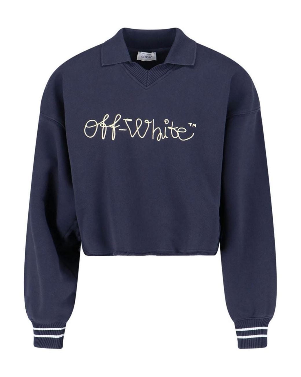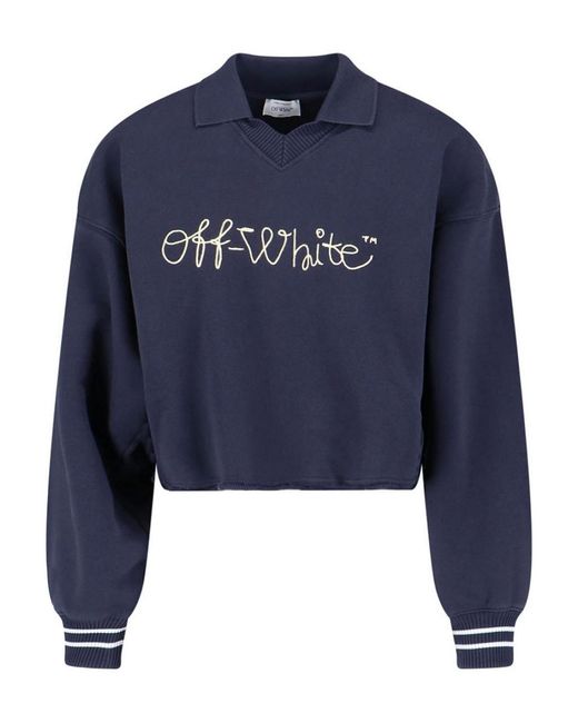 Off white logo jumper, in blue cotton, classic collar, ribbed v-neck, dropped shoulders, front logo embroidery, ribbed cuffs, contrasting details, straight hem. Colour: blue