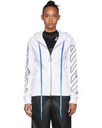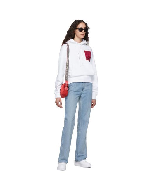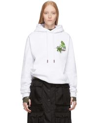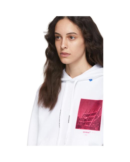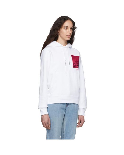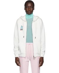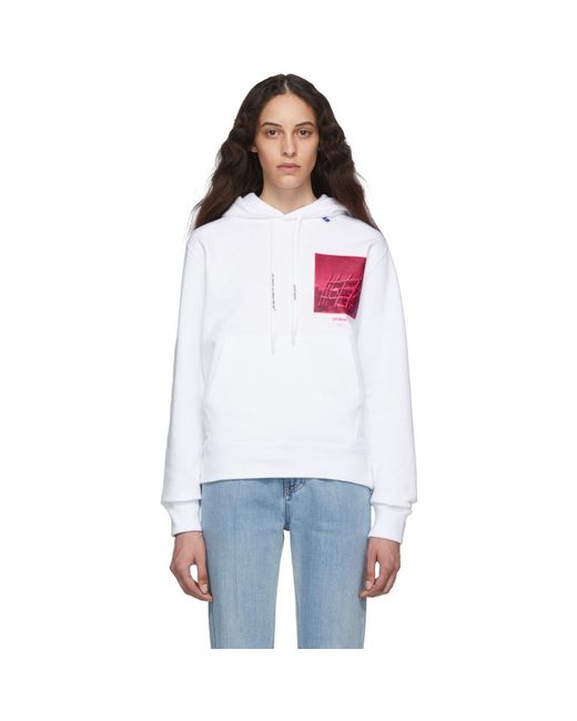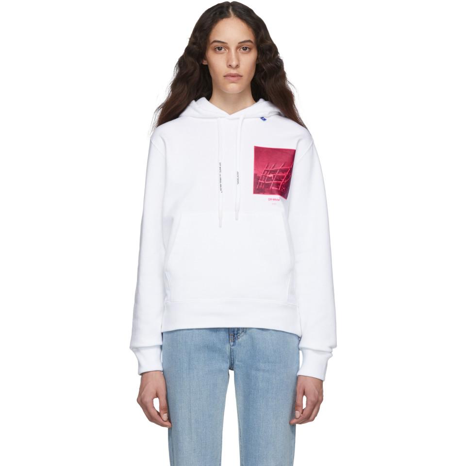 Long sleeve French terry hoodie in white. Logo and text-printed drawstring, and textile flag in blue at hood. Graphic printed in tones of pink at chest. Kangaroo pocket at waist. Rib knit cuffs and hem. Logo and signature graphic printed in fluorescent pink at back. Colour: white