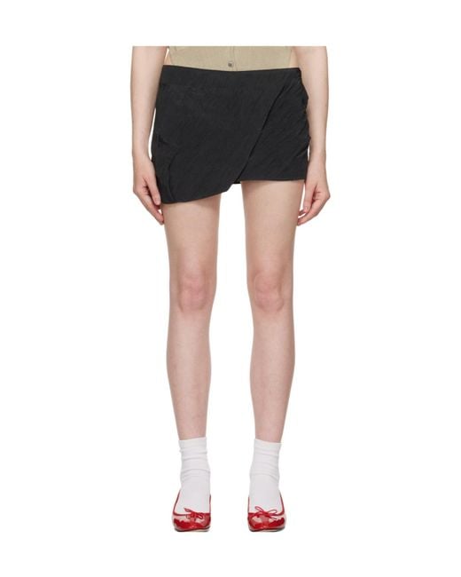Short skirt in crinkled satin with an irregular cut, pleats at the front, a zip fastening at the back and a full satin lining. Colour: black