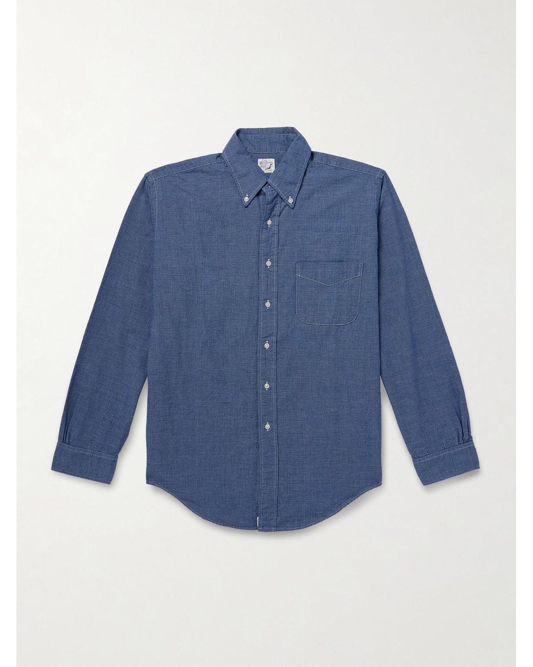 Men's Blue Button-Down Collar Checked Cotton-Chambray Shirt