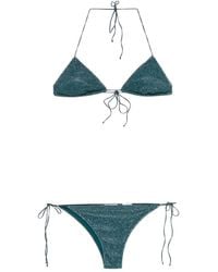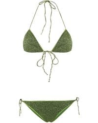 The two-piece swimsuit by OSÉREE is a sophisticated choice for women who appreciate luxurious originality and Mediterranean finesse. The MULTICOLOR style blends contrasting shades—green-mint and golden-beige on the triangle bra, while the bottom captivates with a deep,