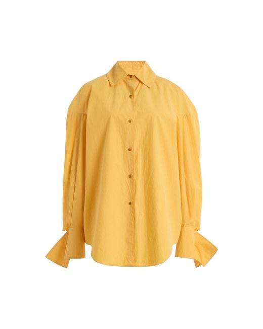Ossou takes its name from the Latin word for bone—the quiet structure beneath everything. Ossou is a ready-to-wear brand with a singular vision: to elevate the foundation of a modern wardrobe.Cut from lightweight cotton; the 'Wren' shirt features draped sleeves that fall from a dropped shoulder to an oversized cuff. Colour: yellow
