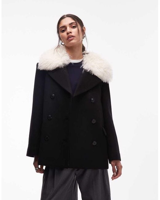 - Wool Short Double Breasted Coat With Flap Welt Pockets And Faux Fur Collar