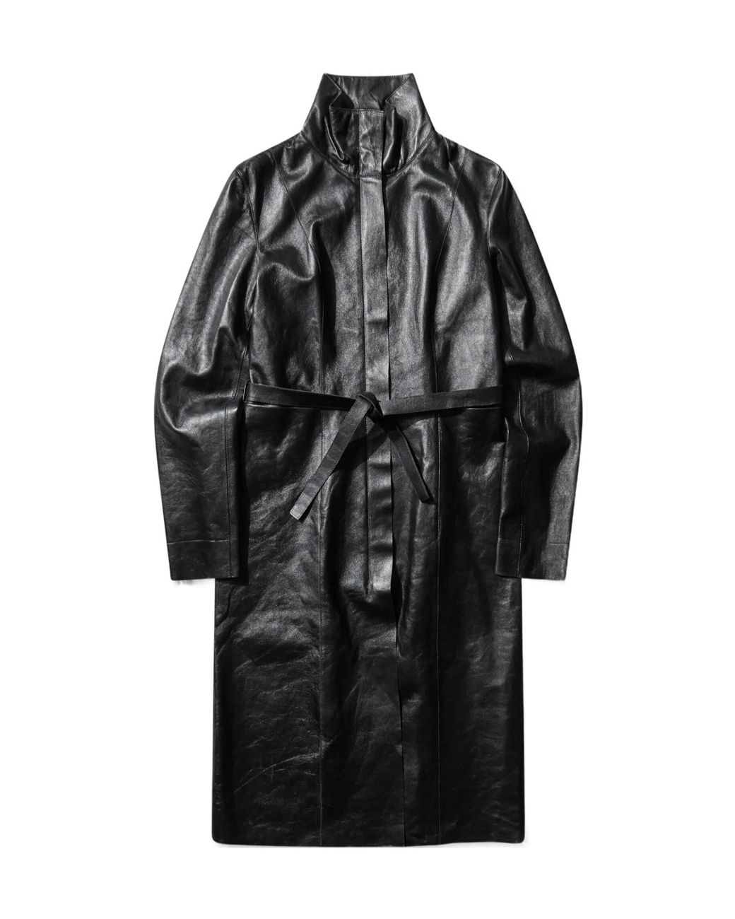 Grained calfskin coat with a funnel neck, a two-way zip fastening, belt loops and a detachable self-tie belt at the waist, raw edges on the hem and cuffs, and partial twill lining. Colour: black