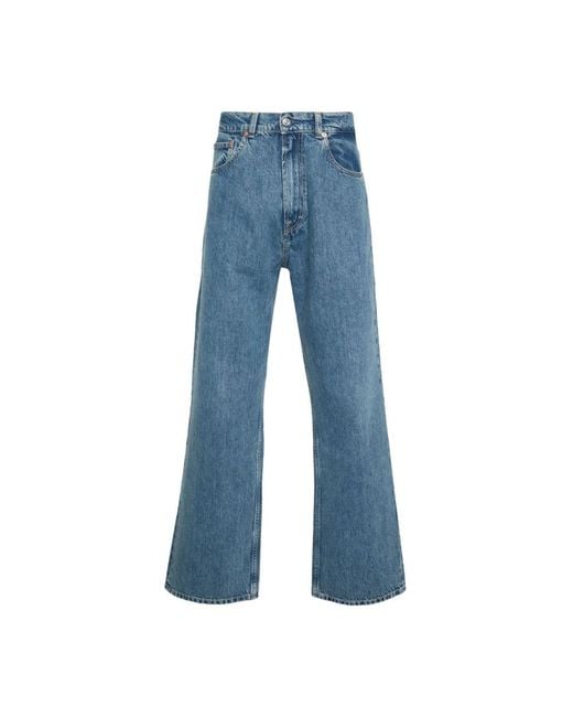 Elevate your style with these Our Legacy straight jeans in medium blue cotton denim. Featuring a logo patch on the rear belt loops, classic five pockets, and a straight leg fit. Complete with a front button and zip fastening for a timeless look. Colour: blue