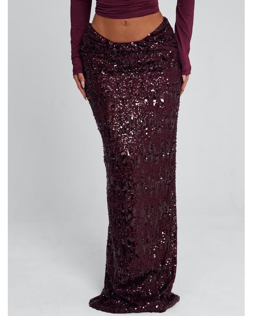 Introducing our Isle Maxi Skirt in Burgundy, designed for after-dark glamour.This stunning low-rise skirt is crafted from a stretch burgundy sequin fabrication that catches the light beautifully. The gathered waistband adds shape and comfort, while a zip entry ensures an easy fit. A sleek maxi silhouette completes the look. Perfect for parties, New Years Eve and festive celebrations. Colour: red