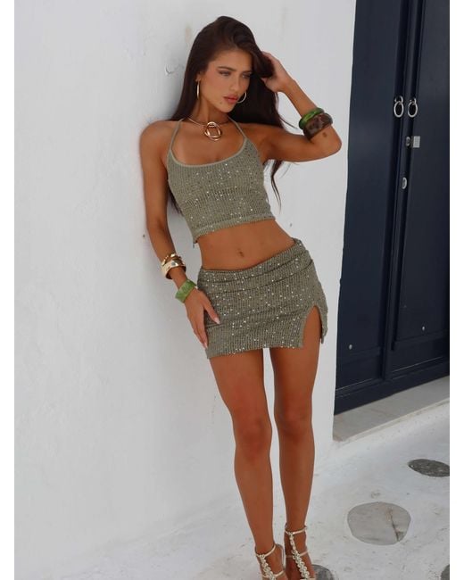 Meet the most stunning sequin set. The Louiseei Cami Top in khaki. Crafted from khaki sequin knit, this top is designed to shine without being over-the-top. It's fully lined for comfort, with a flattering gathered waistband, a front split for a little movement, and a side zip for easy wear. Pair it with the matching skirt and be ready for whatever occasion you throw at it. Colour: green
