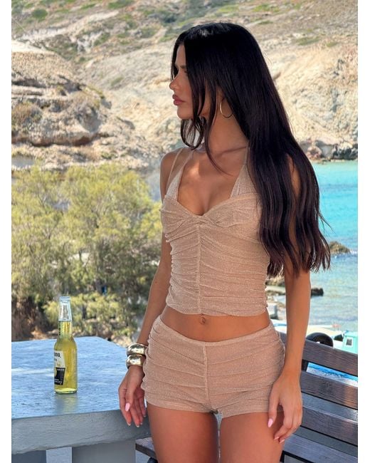 The Milada Shorts are designed to make a statement! Cut from shimmering metallic stretch fabric, they sit low on the waist and sculpt the body with ruched detailing that adds texture and dimension. Their daring micro length ensures a bold silhouette . Perfect for vacation nights, rooftop cocktails, and parties that call for confidence. Pair them with the Milada Top for the perfect co-ord set that guarantees attention. Colour: blue