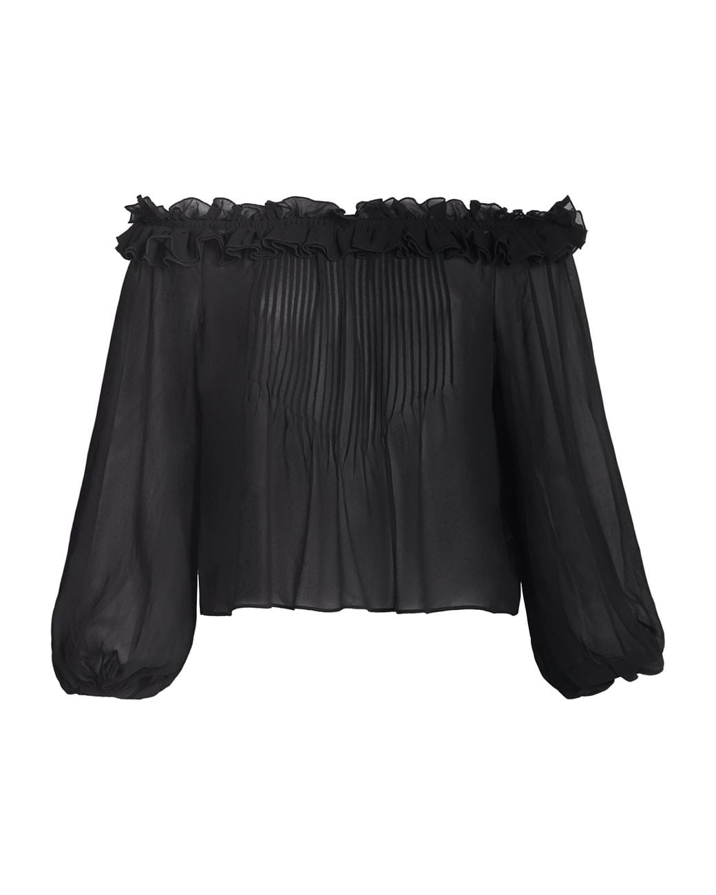 Paige makes silk the focus of the Casey blouse, keeping the construction deliberately light to show off its delicate beauty. The label captures a distinctly bohemian aesthetic with the fine pintucked pleats and ruffled, off-the-shoulder neckline, which effortlessly highlights your décolletage. Colour: black