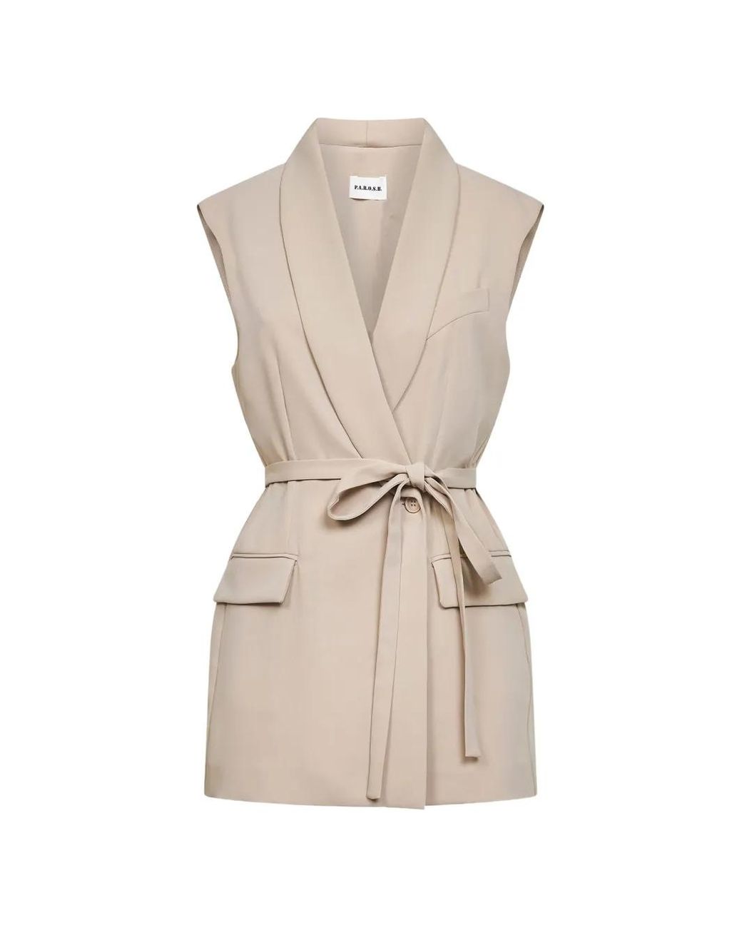 Beige shawl lapels pocket belted sleeveless Size: S. Gender: Female. Material:Polyamide. Colour: natural