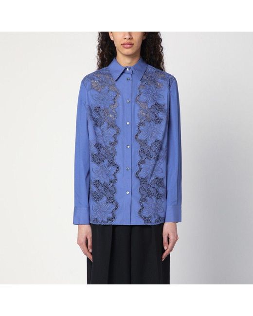 Shirt in light blue cotton poplin, characterized by front buttoning, long sleeves with buttoned cuffs, classic collar, curved hem, and tone-on-tone floral embroidery on the front.SpecificationValueSeasonSS25CompositionFABRIC I: 100% COTTON / FABRIC II: 90% COTTON - 10% POLYESTERColorBLUEColor Code046Made InITALYISOITDepartmentWomenSectionCLOTHINGSubsectionSHIRTSSize InformationSTANDARDSize CodeSML