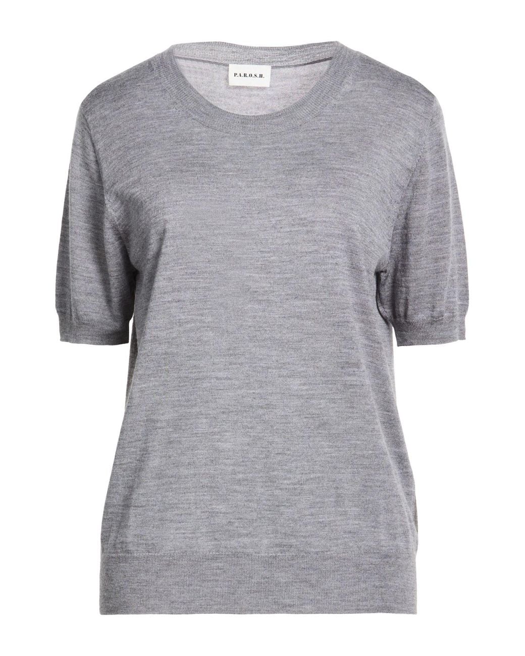 P.A.R.O.S.H.. knitted, lightweight knit, plain colour, no appliqués, crewneck, short sleeves, dry clean, do not bleach, do not tumble dry. 70% Wool, 20% Silk, 10% Cashmere. Colour: grey