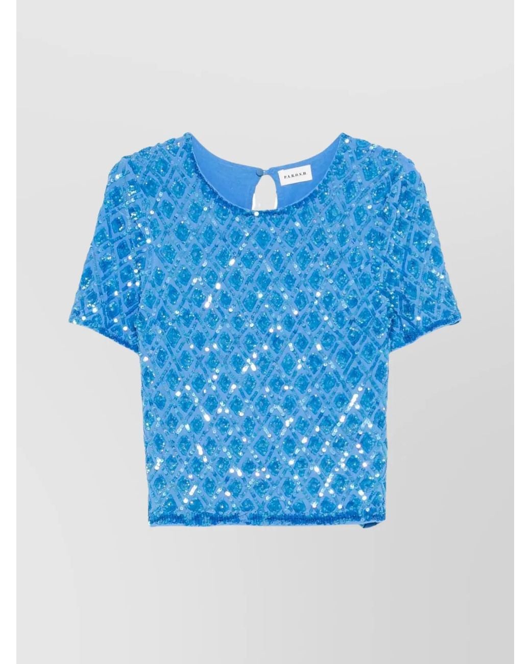 Short sleeves | Cropped length | Sequin embellishments | Keyhole back Colour: blue