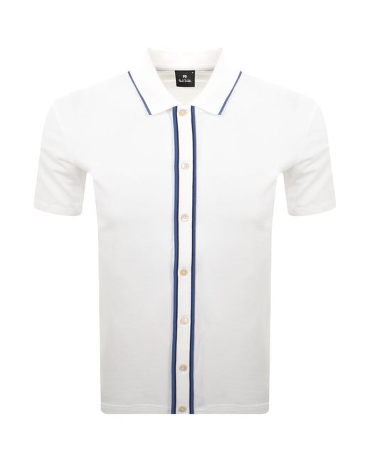 Paul Smith Button Front Polo T Shirt In White. A full front button fastening with a ribbed polo collar featuring a tipping design. Short sleeves with the striped tipping designs on the placket. The signature woven Paul Smith logo pinch tag is situated on the bottom left seam. Side vents at the hem. 94% Cotton And 6% Elastane. Colour: white