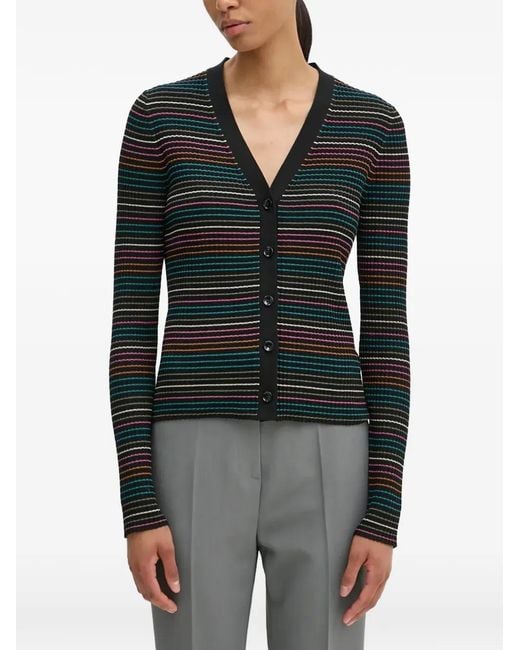 Black striped V-neck button fastening long sleeves ribbed texture Size: XS. Gender: Female. Material:Wool. Colour: black