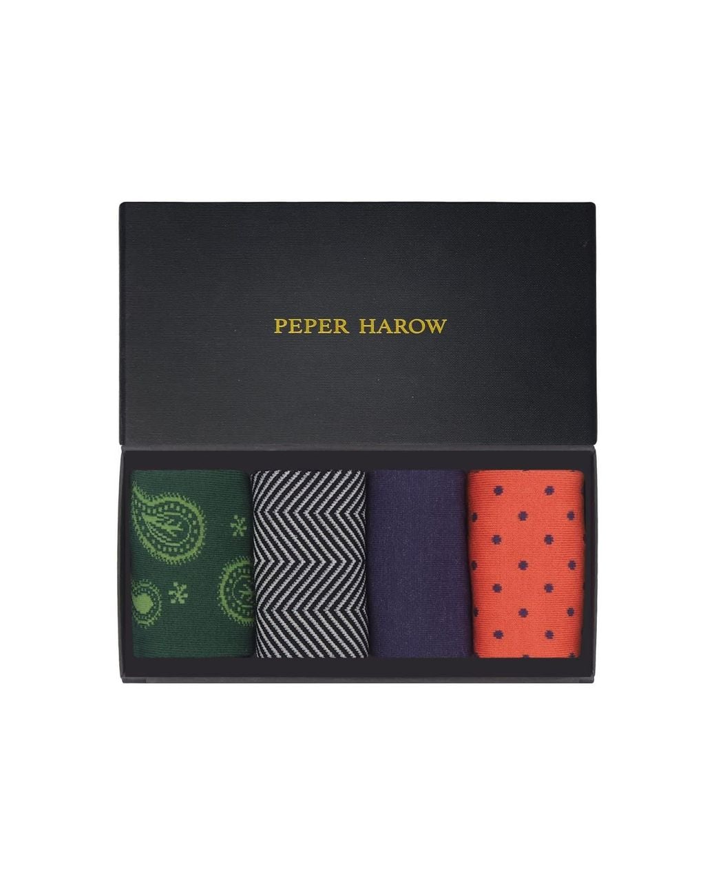 Step into refined eccentricity with the Spooky Men’s Gift Box, an exclusive four-pair collection from Peper Harow. Featuring the Pin Polka in orange, Mayfair in purple, Lux Taylor in black and Paisley in green, this selection celebrates playful British sophistication. Each sock is meticulously crafted in England from the finest Supima or mercerised Egyptian cotton, ensuring an exceptionally soft feel, breathability and long-lasting comfort. The seamless toe design and expert hand-finishing guarantee superior fit and quality. Ethically made and presented in a sleek gift box, this bundle is perfect for the gentleman who appreciates bold design, craftsmanship and a touch of Halloween-inspired flair. MATERIAL Pin Polka: 80% Supima cotton, 20% Polyamide. Mayfair: 75% Mercerised Egyptian cotton, 25% Polyamide. Lux Taylor: 72% Supima Cotton, 27% Polyamide, 1% Spandex. Paisley: 52% Organic Cotton, 46% Polyamide, 2% Spandex. CARE: Wash inside out, with similar colours and at 30 degrees. Colour: green