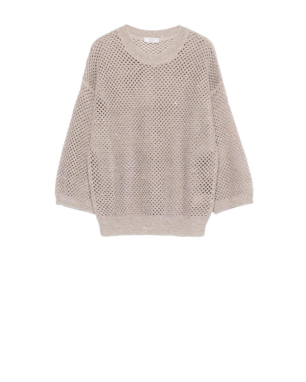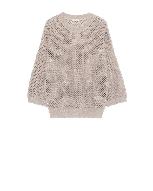 Open-knit mesh jumper in a light beigetaupe tone with subtle shimmer detail throughout the fabric. Features a round neckline, long sleeves with dropped shoulders, and ribbed cuffs and hem. Relaxed, oversized silhouette with visible open-weave construction. Colour: white
