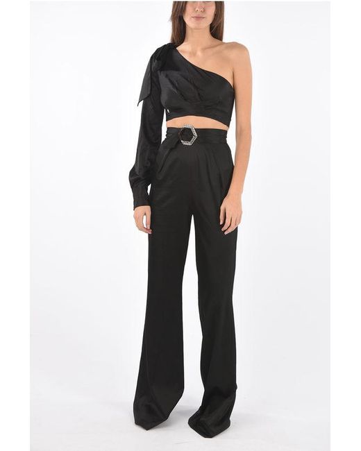 Women's Black Couture Boot-Cut Set With Silk One-Shoulder Crop Top