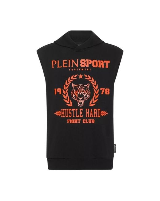 Men's sleeveless black t-shirt by Plein Sport featuring a hood, iconic tiger graphic in orange on the front, side seam pockets, and ribbed hem. Made of soft cotton blend (88% cotton, 12% polyester). Colour: black