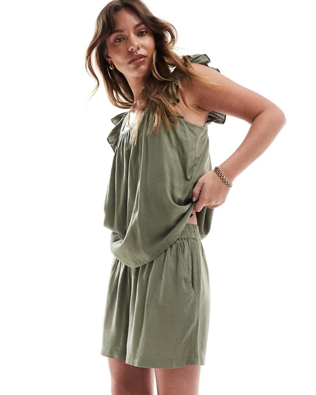 Linen Touch Flutter Sleeve Cami Top Co-ord - Green