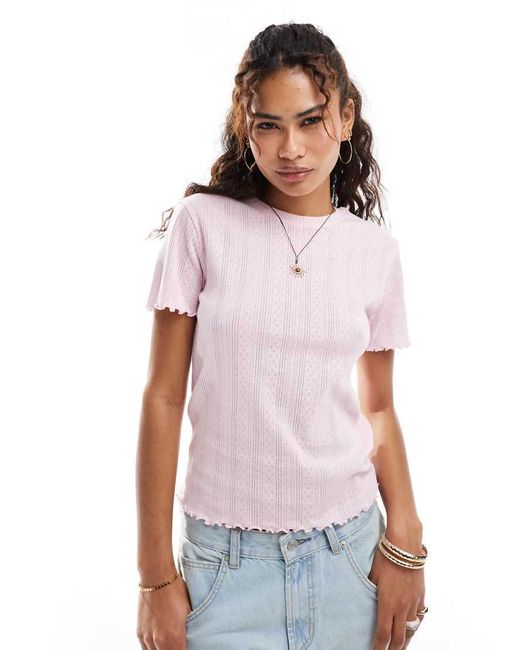 Ribbed Short Sleeve Top With Crochet Trim Collar Detail - Pink