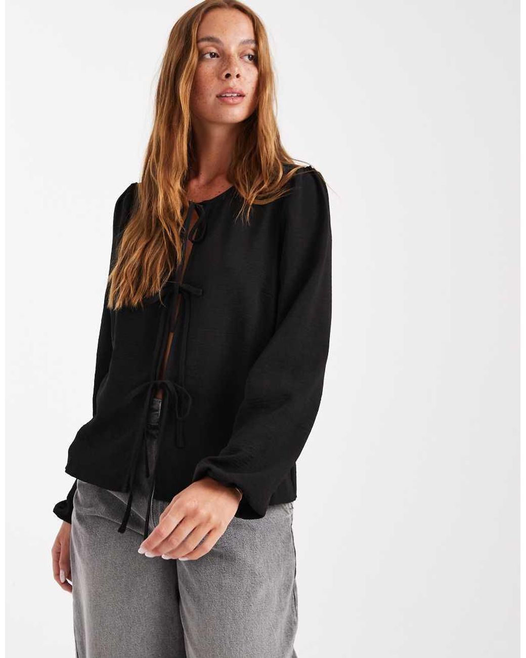 Tops by Pieces Round neck Tie front Long sleeves Regular fit. Polyester. Colour: blue