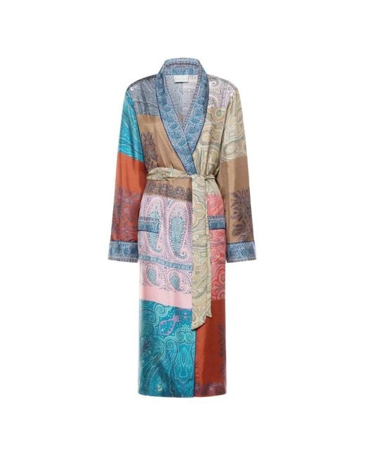Blue paisley print shawl collar belt long sleeves Size: One Size. Gender: Unisex. Material:Silk.