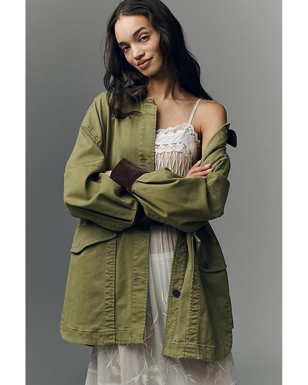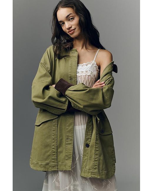 Perfect for your spring outerwear rotation, this longline barn jacket features a button front, flap pockets and corduroy trims for a touch of texture. Oversized Barn Coat Jacket by Pilcro, Women's Size: 2XS, Cotton/Lyocell/Spandex at Anthropologie Colour: green