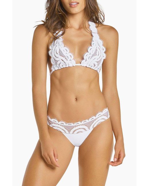 STYLE: Bright white lace full-cut hipster bikini bottom. White lace band with scalloped trim with nude lining makes these bottoms sexy and romantic. Low rise hipster front elongates your torso while the full backside cut offers more coverage. Pair these bottoms with the Bralette Lace Bikini Top and have the perfect bikini for your honeymoon or pool party. CARE: Self: 86% polyamide, 14% elastane, Lining: 75% polyamide , 25% elastane. Hand wash cold. Made in Colombia. Colour: white
