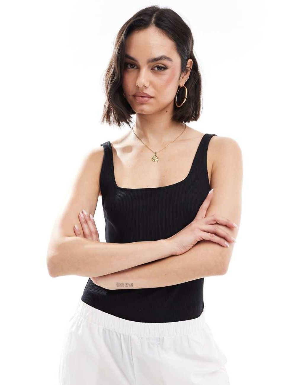Women's Black Ribbed Cotton Square Neck Bodysuit