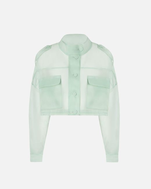 Cropped pea coat in pure silk organza, a fabric with a dry, crisp feel that perfectly combines the technical component and refined sensuality. Lightweight and sheer, the garment does not compromise on functional details, such as the stand-up collar with button, shoulder tabs, two large front patch pockets with flaps, buttoned cuffs, and a front button fastening. The ideal outerwear to express your femininity with original overlays and combinations in pure PINKO style. Colour: green