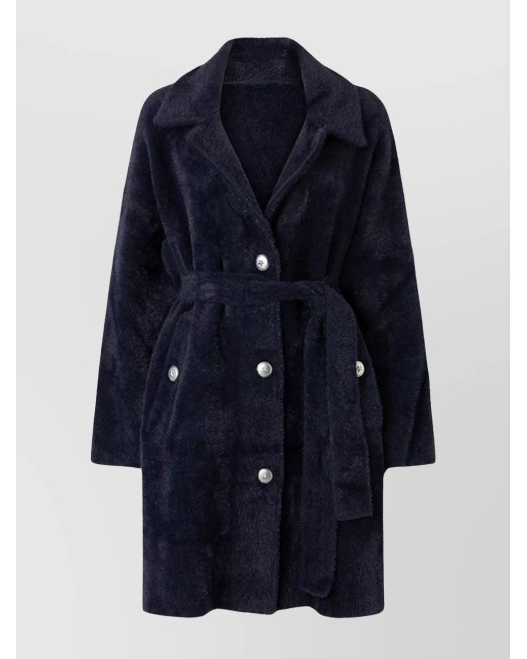 Belted waist | Faux fur texture | Double-breasted design | Notched lapels | Button closure Colour: blue
