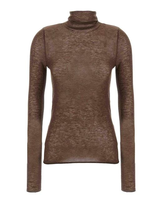 Ultrafine wool 'moss' jumper with all-over sequin appliqu, high neck, long sleeves, and tone-on-tone logo patch on the back. Colour: brown