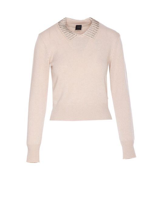 Pinko beige Ventotene sweater, crewneck, crystals on collarComposition: 48% Nylon, 27% Viscose, 20% Wool, 5% Cashmere