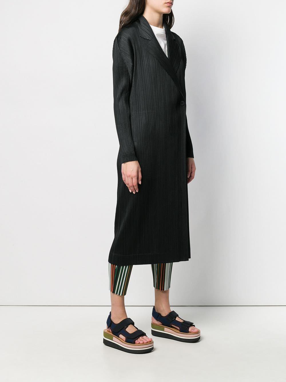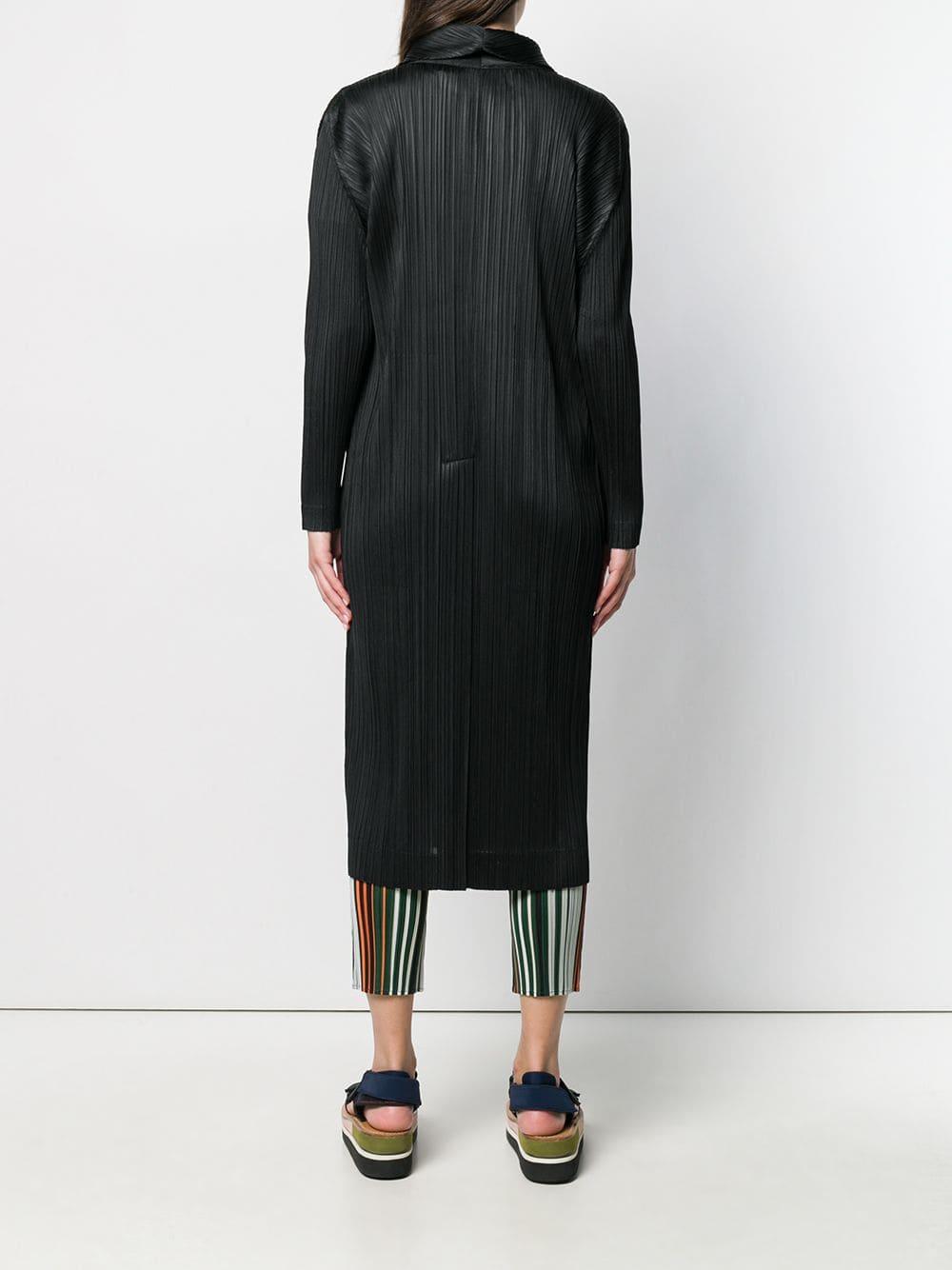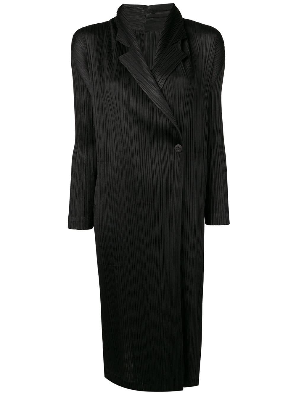 Go to FarfetchJapanese designer Issey Miyake is known for his technology-driven clothing designs that have catapulted the brand into the forefront of the industry. Expect innovation and passion with a side of humour. Black lightweight coat from Pleats Please By Issey Miyake featuring classic lapels, a front button fastening, a long length and signature Miyake pleats finish. Colour: black