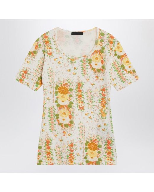 Prada cotton T-shirt with all-over floral print in shades of orange, featuring a wide crew neck, short sleeves, ribbed design, triangular fabric patch on the back, and logo lettering patch on the back.SpecificationValueBrandPradaAge GroupadultColorOrangeMaterialCottonMade InItalyGenderMenSizeLSeasonFW25/26